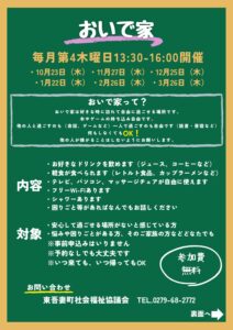 10月23日から毎月第4木曜日においで家(居場所)を別添チラシのとおり開催します。
